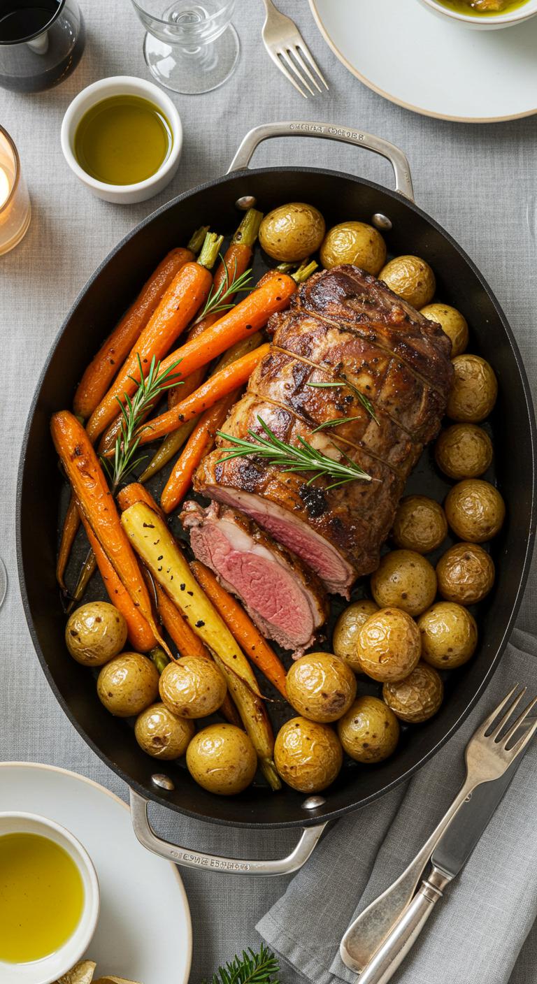 One-pan roasted lamb with sweet, caramelized root vegetables — cozy holiday comfort with minimal fuss.
