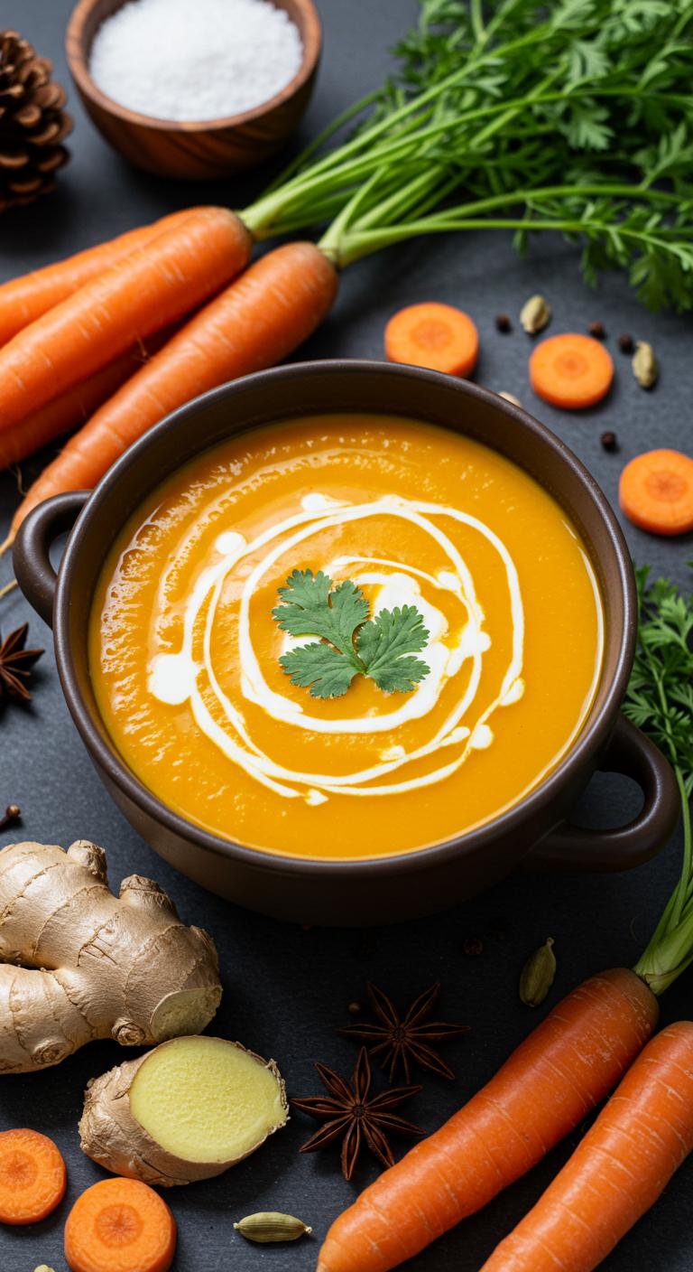 Bright, cozy carrot soup with warming spices and a swirl of coconut cream — holiday comfort in a bowl.
