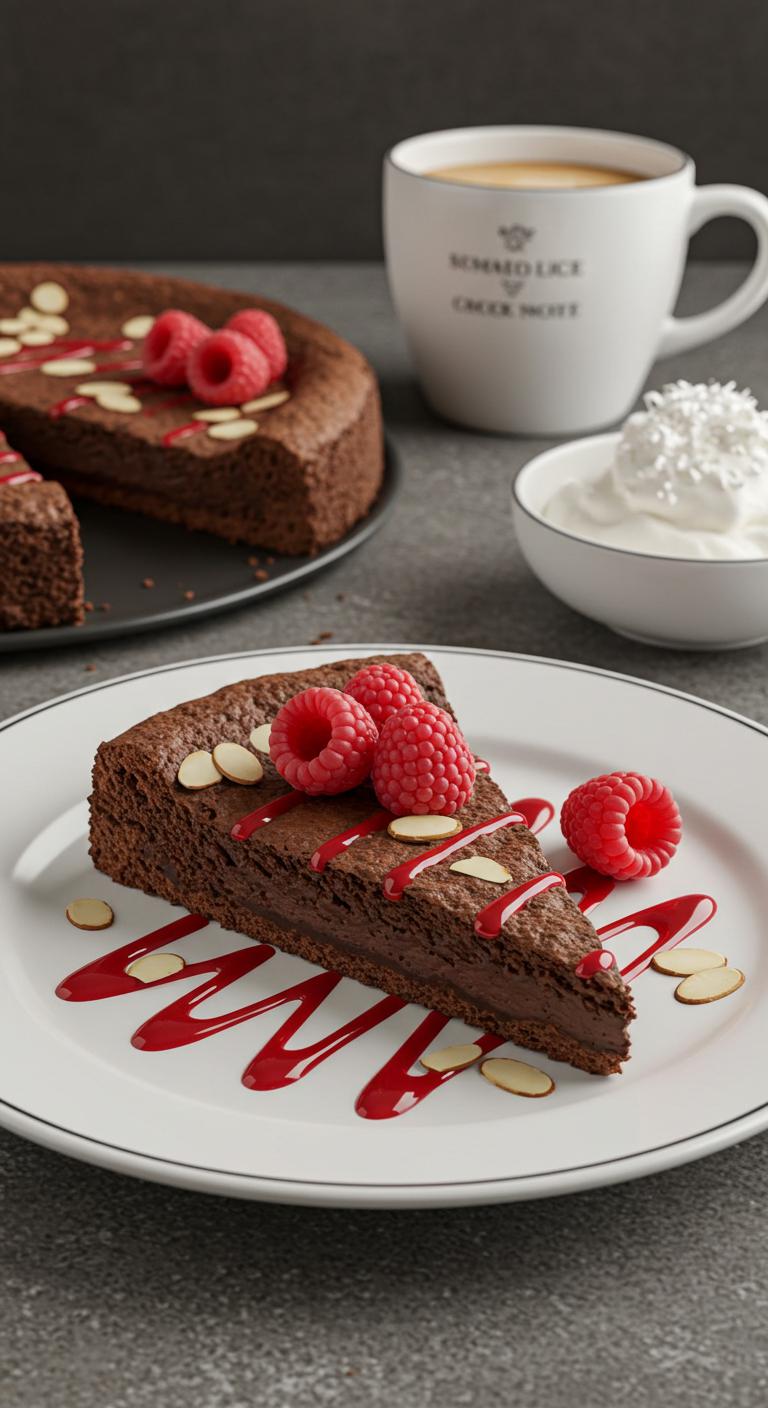 - Dust the cooled torte with cocoa powder, slice, and drizzle each slice with raspberry coulis. Garnish with fresh raspberries and toasted almonds if using.