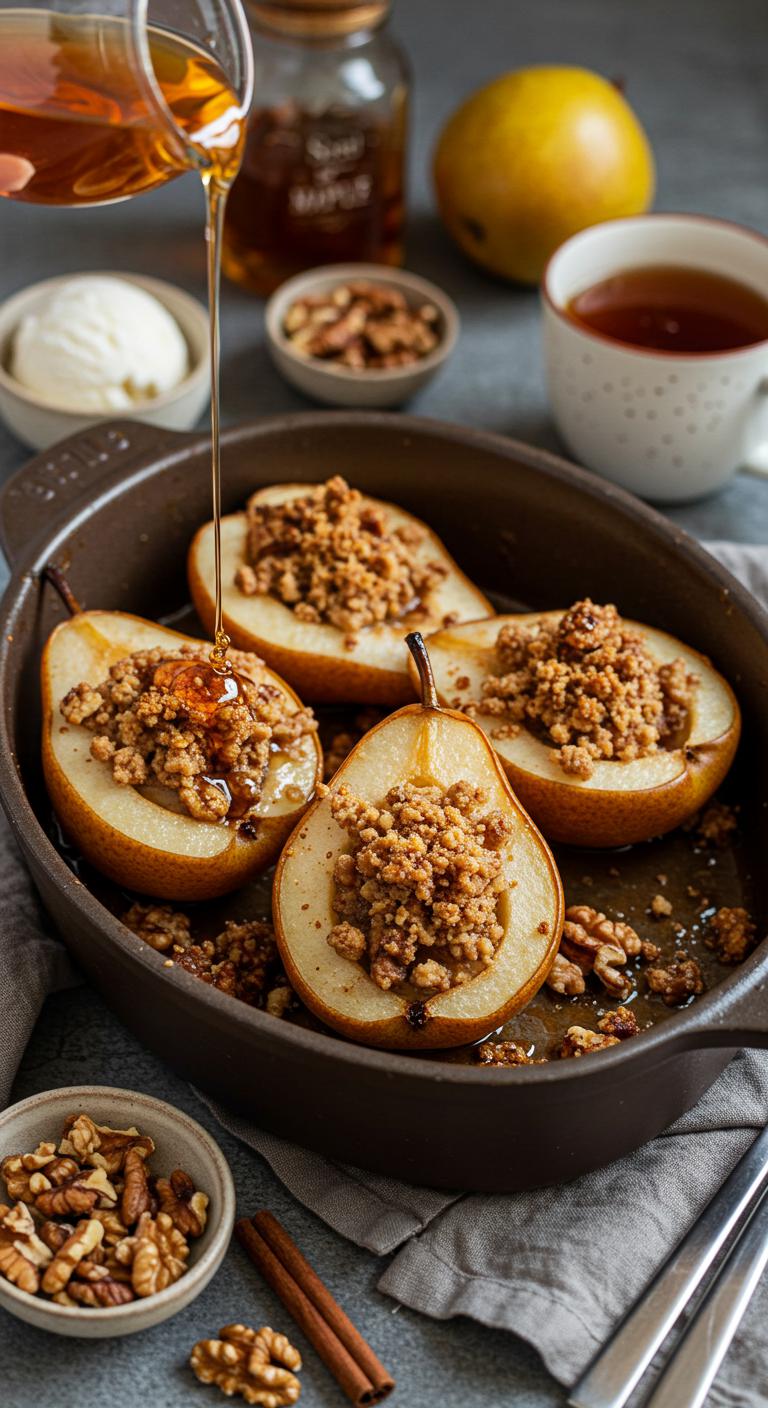 Warm, spiced baked pears topped with crunchy walnut crumble and a drizzle of maple — cozy dessert in minutes.