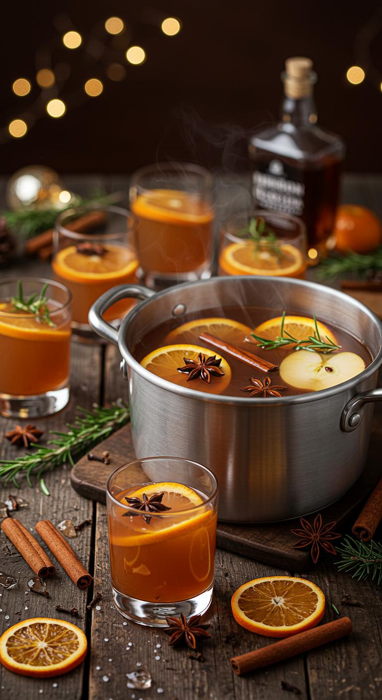 - Garnish with orange and apple slices, a cinnamon stick, and a sprig of rosemary in each cup.