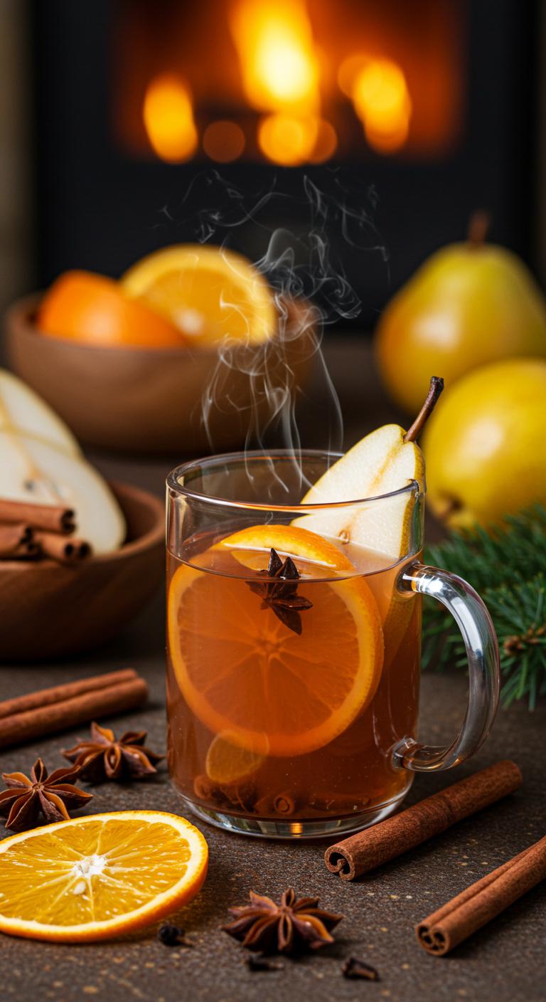 - Garnish with orange slices, fresh pear slices, and a cinnamon stick in each cup.