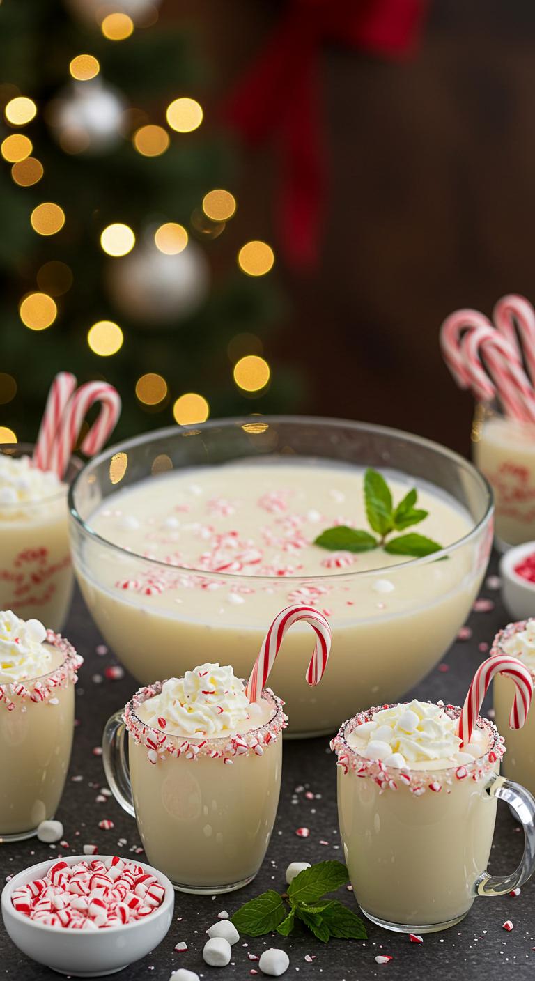 - Ladle into cups or a punch bowl, top with whipped cream or mini marshmallows if desired, and garnish with extra crushed candy cane and a mint sprig.