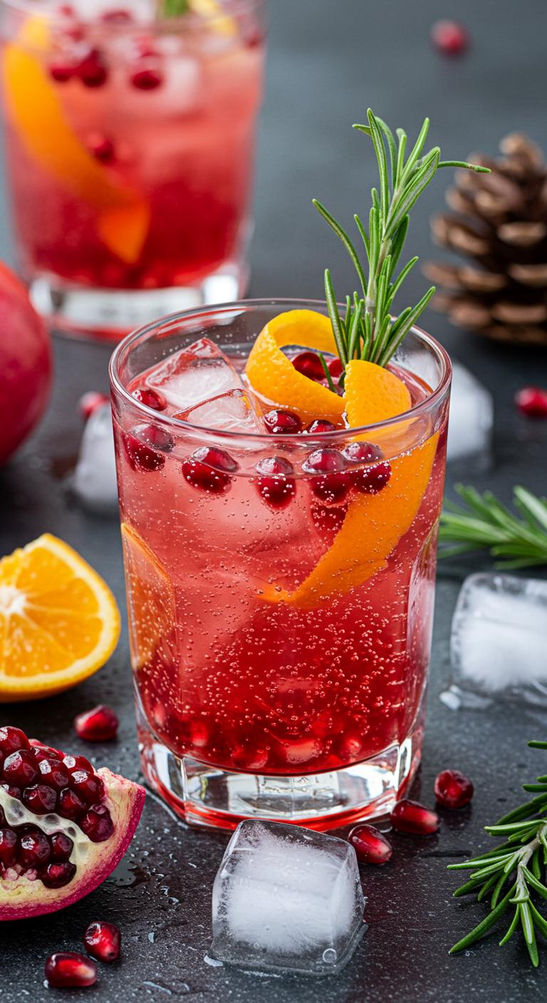 - Garnish with pomegranate seeds, an orange slice or twist, and a small rosemary sprig.