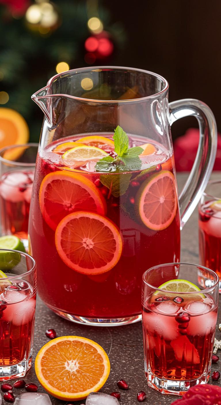 - Add cranberries, lime slices, and mint sprigs to the pitcher or float them in each glass.