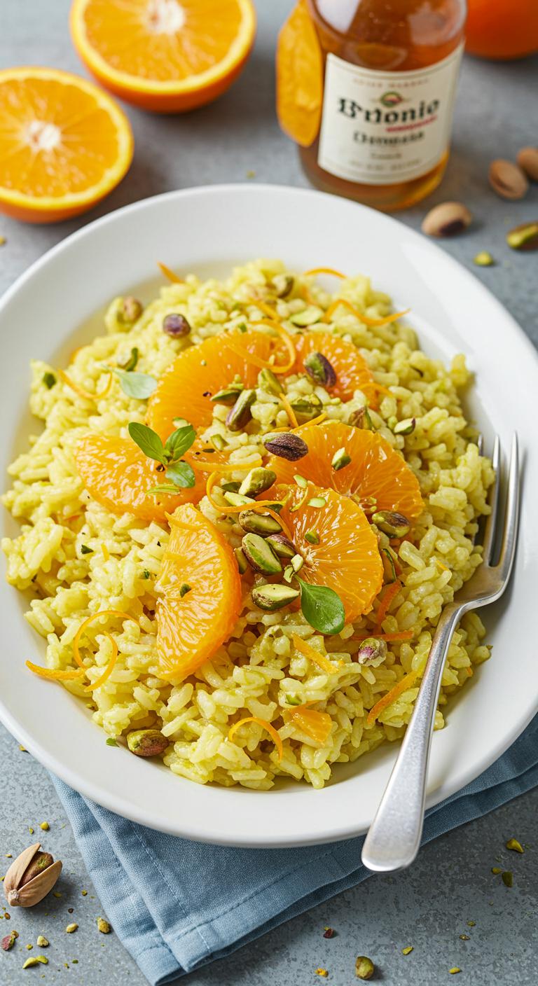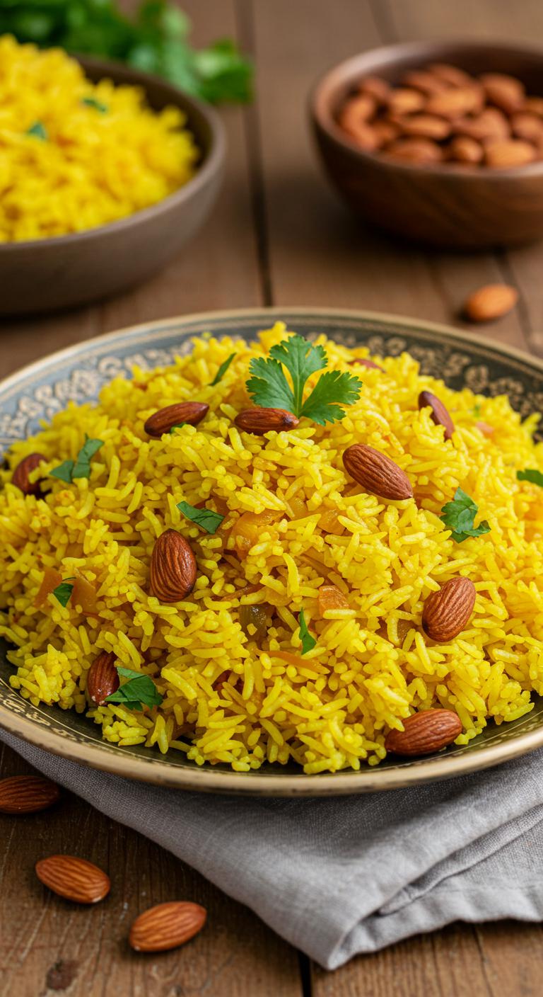 Saffron and Almond Pilaf — golden, fragrant rice studded with toasted almonds.