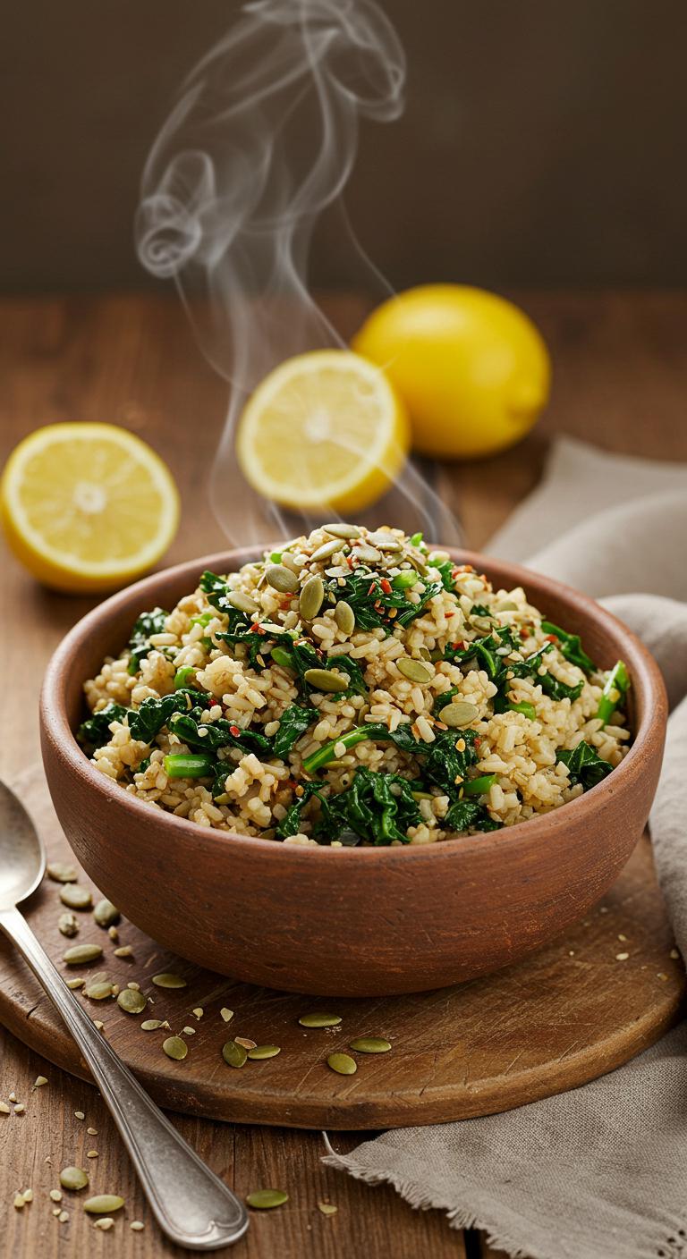 A hearty, nutty brown rice bowl brightened with garlicky kale and crunchy toasted seeds — cozy and wholesome for chilly days.