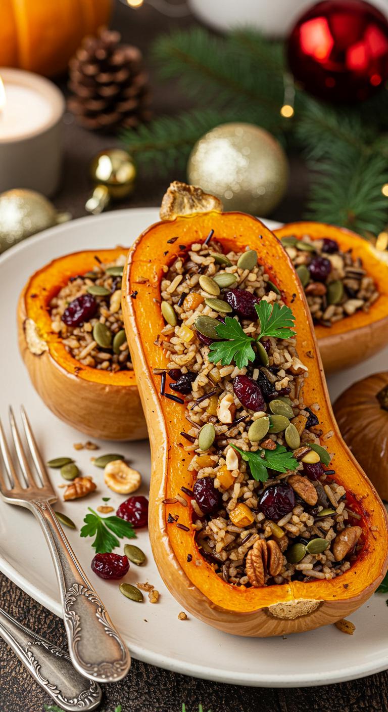 A hearty, festive stuffed butternut squash bursting with savory wild rice, tangy cranberries, and toasty nuts — perfect for a holiday centerpiece.