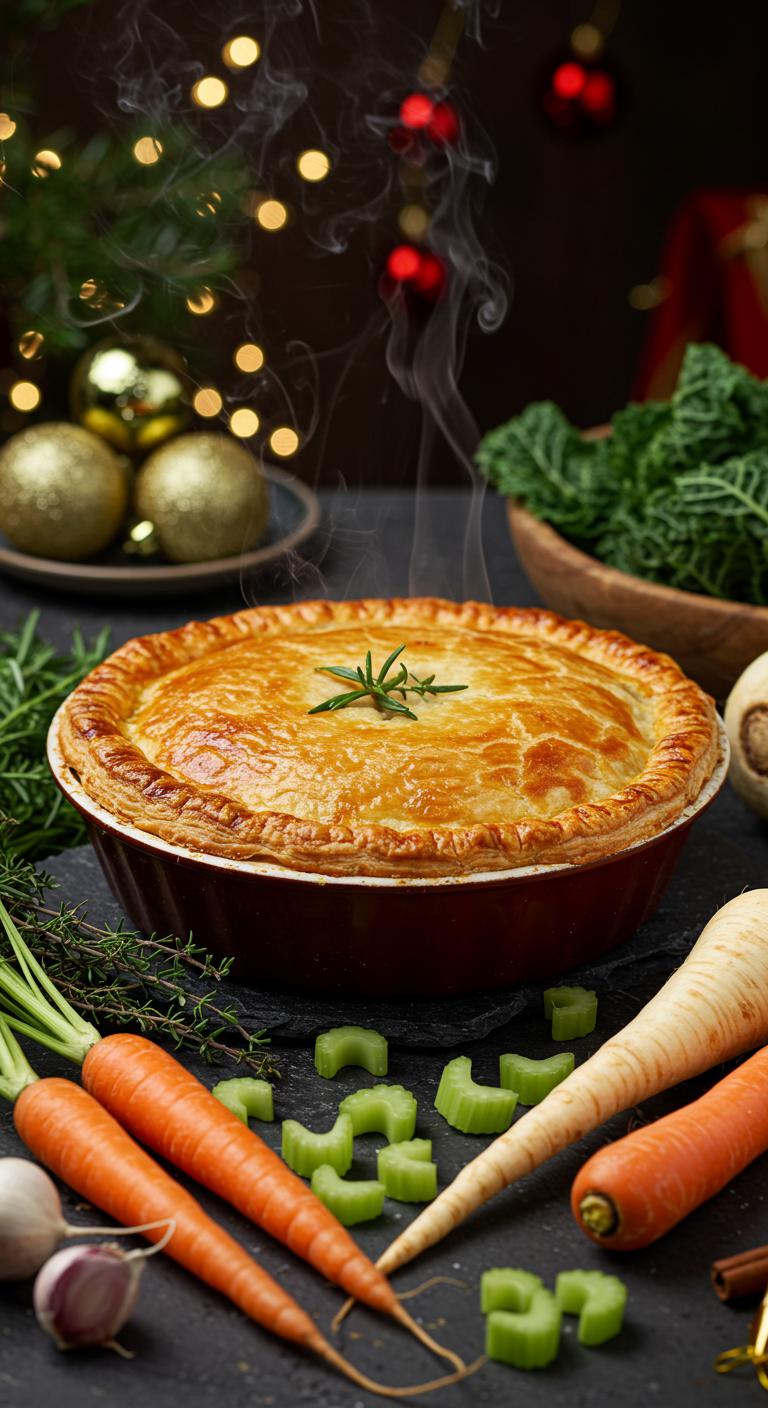 A cozy, herby chickpea and root vegetable pot pie that’s golden, flaky, and perfect for holiday comfort—vegan and full of savory warmth.
