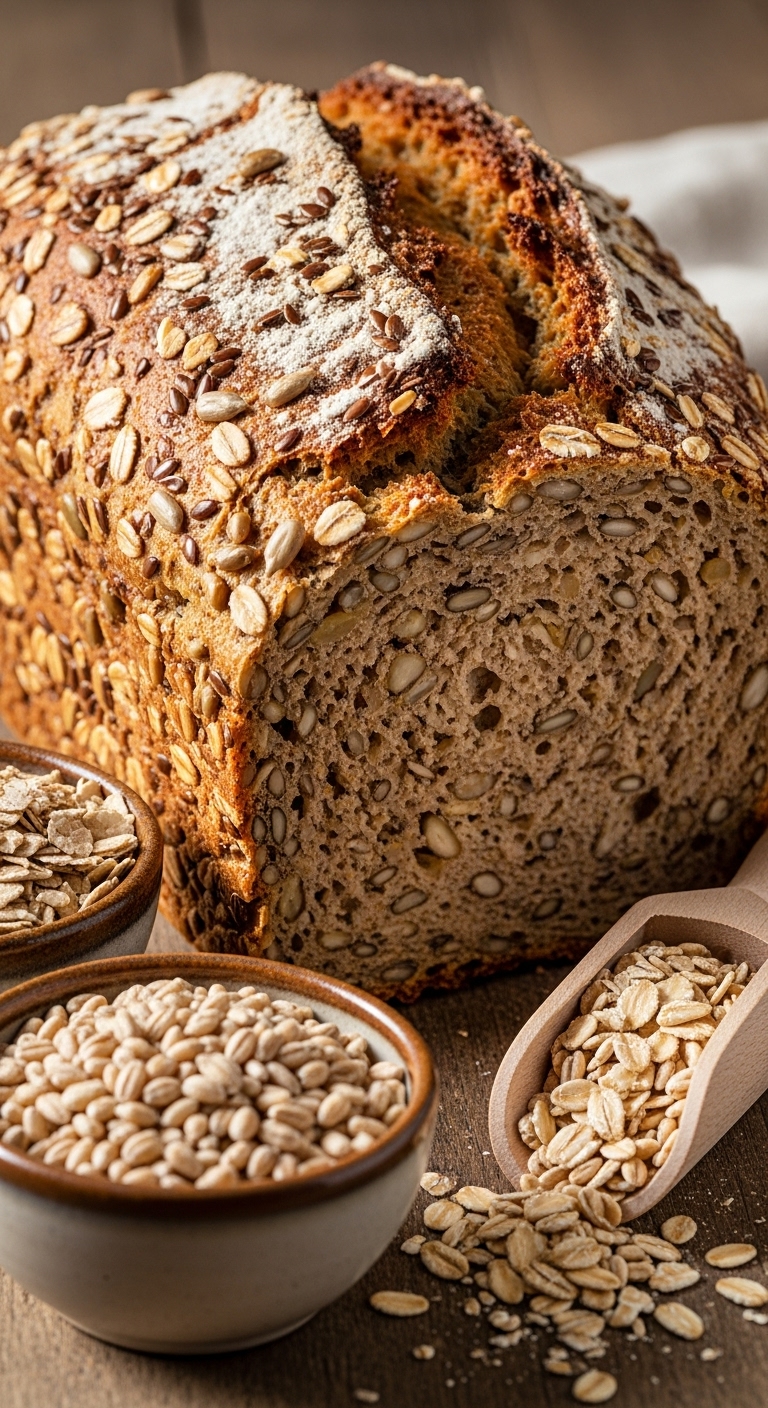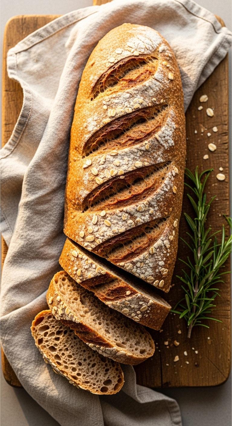 Slice thickly and toast with avocado and pepper flakes. Garnish with toasted sunflower seeds. Pairs with soups, melty cheese, or honey butter. Store wrapped in cloth for 2–3 days, or freeze slices. Make whole loaves ahead and freeze for quick weekday breakfasts.