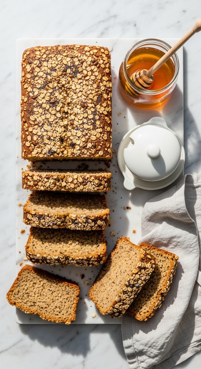 Serve warm slices with soft butter and a drizzle of honey for breakfast. Garnish with extra rolled oats and a sprig of thyme for pictures. Pairs well with coffee, yogurt, or sharp cheddar. Store in a paper bag at room temp for 2–3 days, or freeze sliced. Make-ahead: freeze baked slices and toast as needed.
