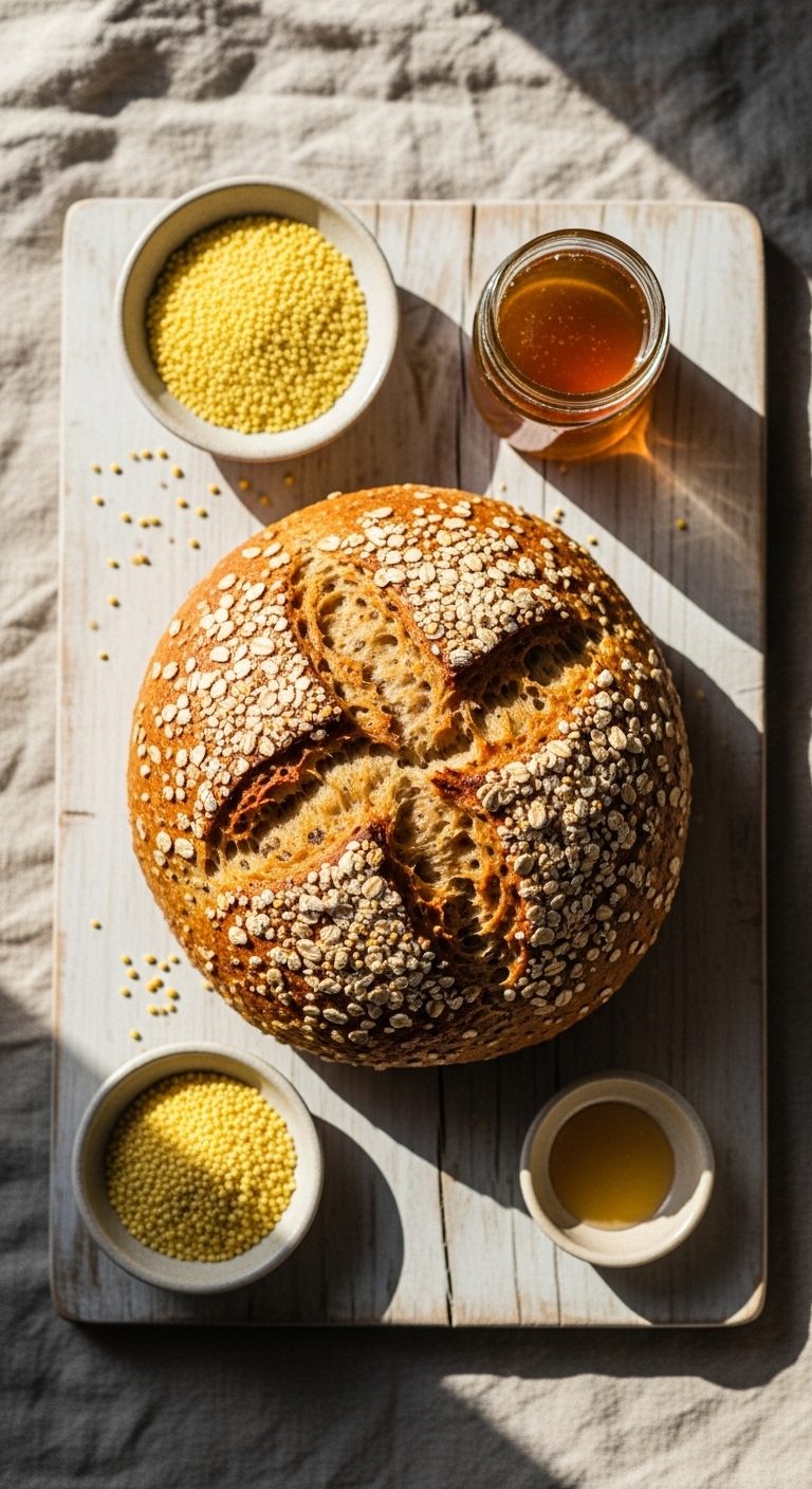 This sprouted millet and sprouted grain honey oat sourdough bread uses sprouted grains for extra nutrition and digestibility. Honey and oats create a tender texture while sprouts add a subtle crunch. It’s great for health-focused breakfasts and nutrient-dense sandwiches. You’ll notice a fresh, grassy aroma and a lively crumb.