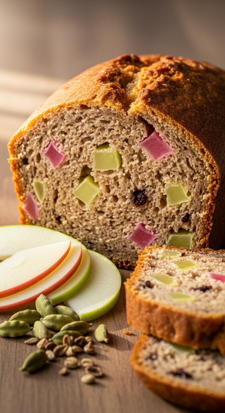 Serve warm with butter or mascarpone and a light honey drizzle. Garnish with thin apple slices and a sprinkle of cardamom. Pairs with tea or lightly spiced coffee. Store wrapped for 2–3 days; freeze slices. Make-ahead: fold apples into dough the night before for morning baking.