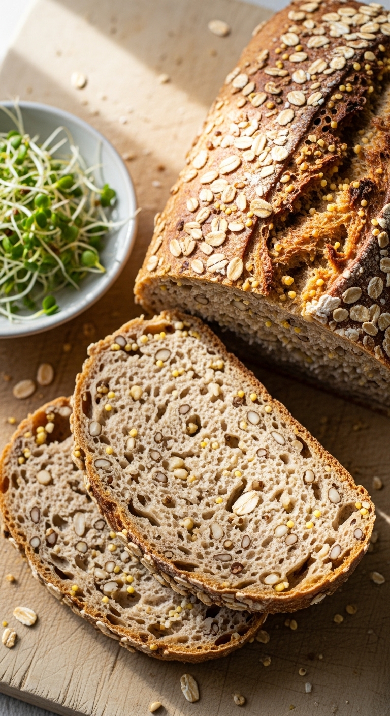 Toast and top with hummus and sprouts, or almond butter and sliced banana. Garnish with extra sprouts or seeds. Pairs with green smoothies or herbal tea. Store in breathable bag for 2–3 days; freeze slices. Make-ahead: prepare sprouted grains in advance and mix when ready to bake.
