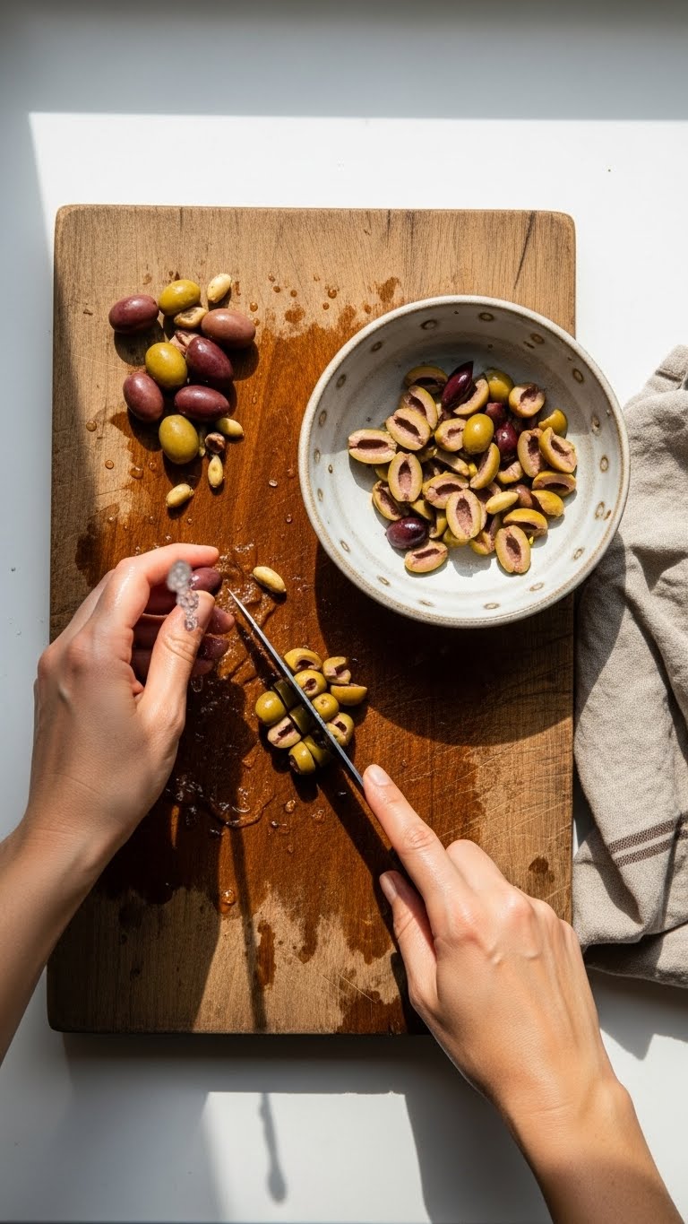Tip: Use brined green or Kalamata olives depending on the flavor you want. Rinse if very salty, then pat dry to avoid adding excess liquid.