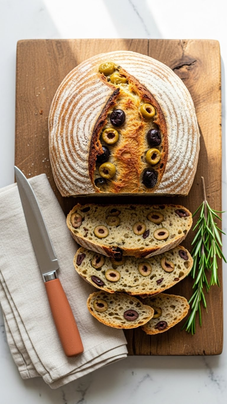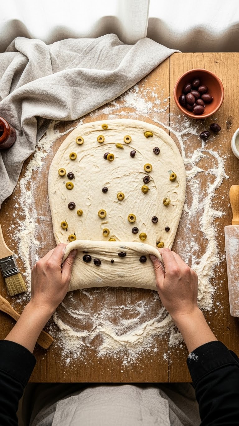 - Work with slightly tacky (not wet) dough — too wet and olives sink; too dry and they won’t incorporate.