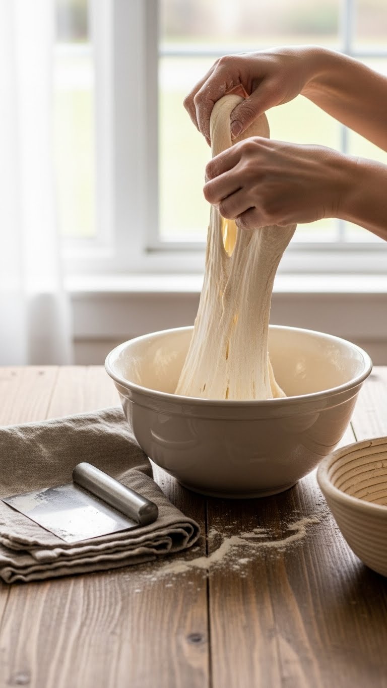 - Perform 4 sets of stretch-and-folds every 30 minutes for the first 2 hours. Then leave until dough rises ~30–50%.