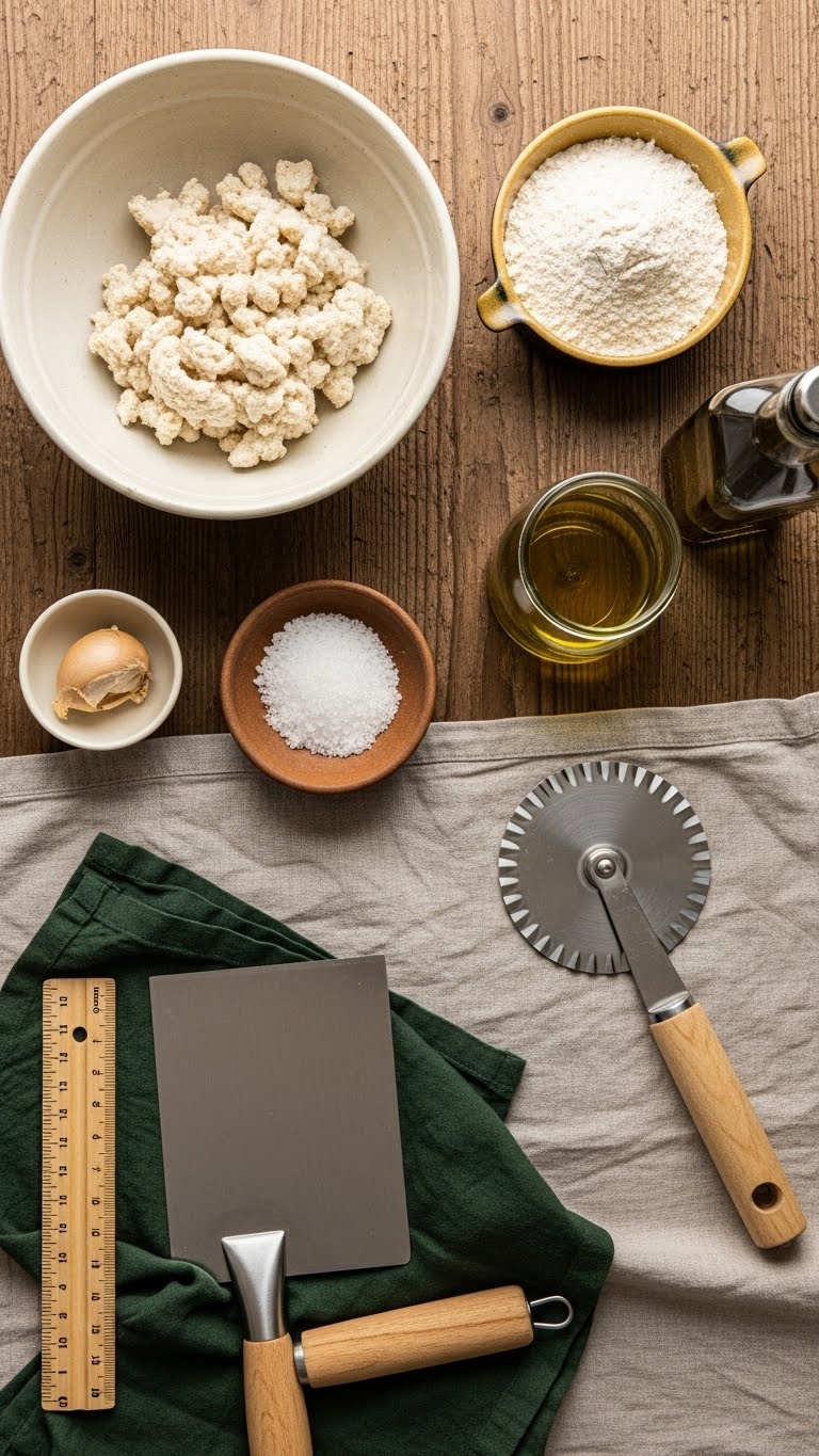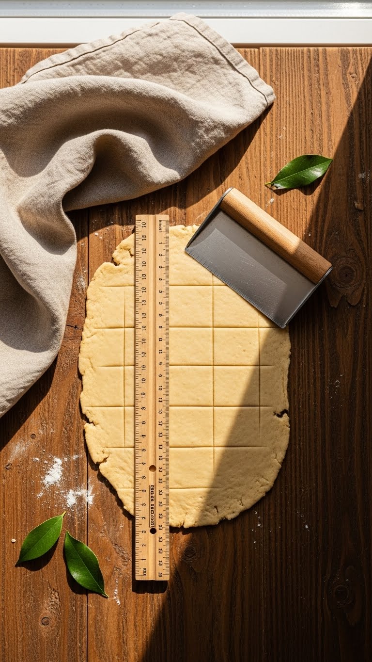- Tools: bench scraper or sharp knife, metal ruler or straight-edge, rolling pin, baking sheet, parchment paper, fork for docking.