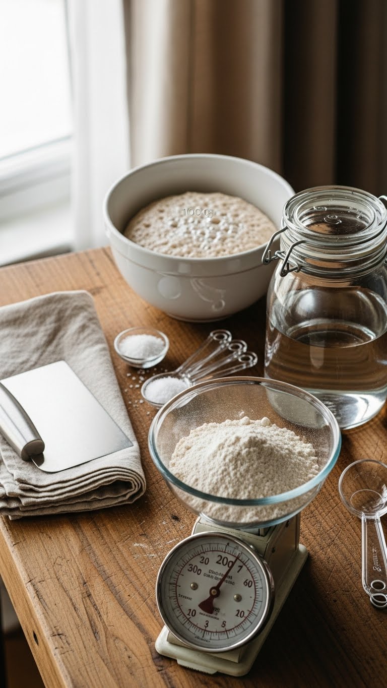- Tools: scale, bench scraper, banneton, Dutch oven, thermometer