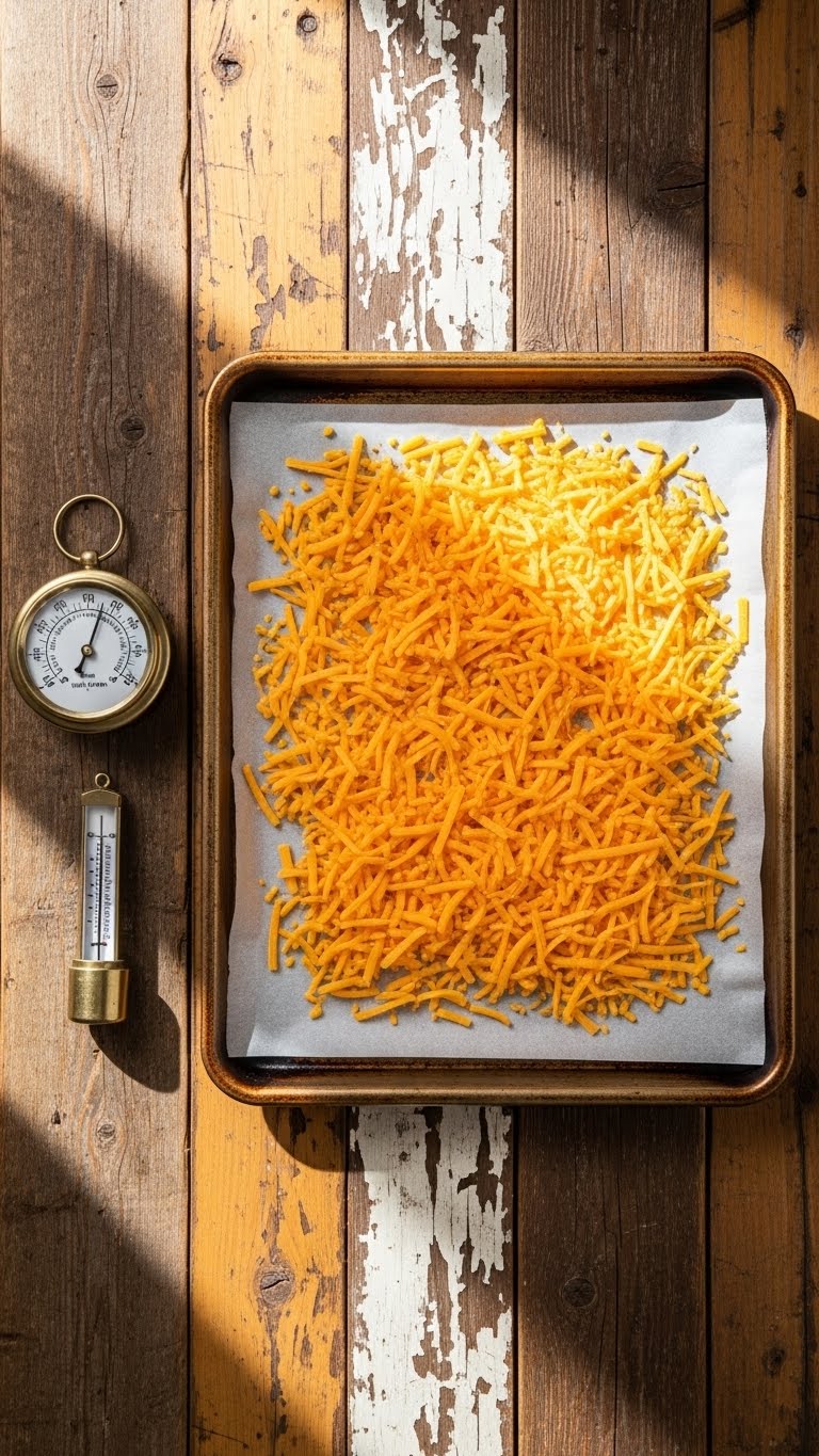 - Spread the finely grated cheddar in a single layer on a parchment-lined baking sheet.