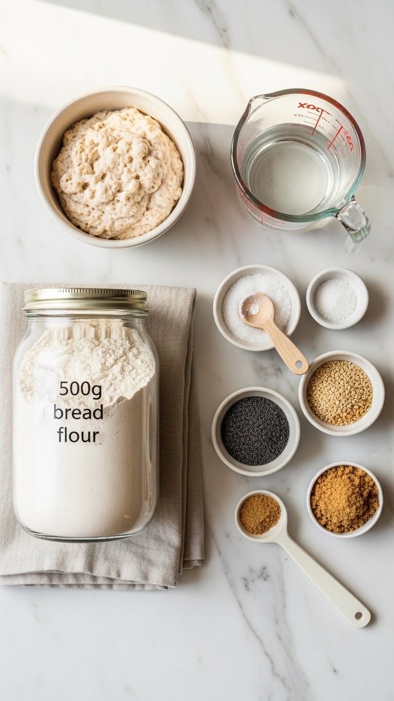 - Autolyse: Mix 500 g flour and 300 g water until no dry streaks. Rest 30 minutes.
