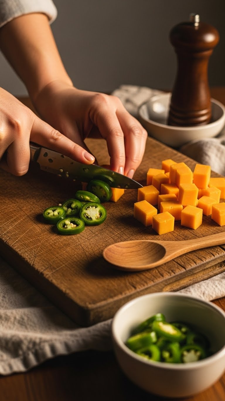 - Gently fold in 150 g cheddar and diced jalapeños until distributed.