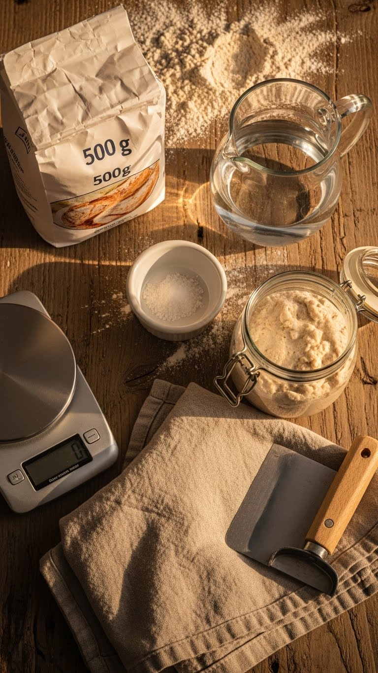 - Digital scale, bench scraper, lame or sharp razor, baking stone or steel, steam source (Dutch oven or tray), linen cloth