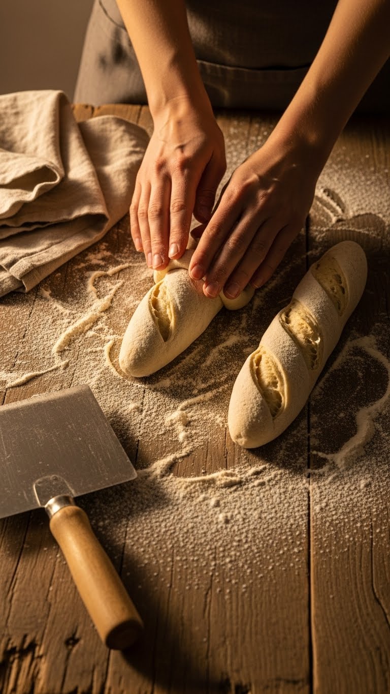 - Pre-shape gently, rest 15–20 minutes, then shape tightly into baguettes using your bench and thumbs to create surface tension.