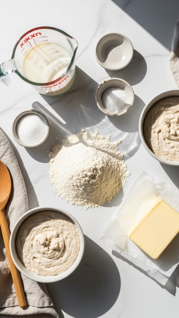 - Tip: Use an active, bubbly starter. Feed it 4–8 hours before mixing.