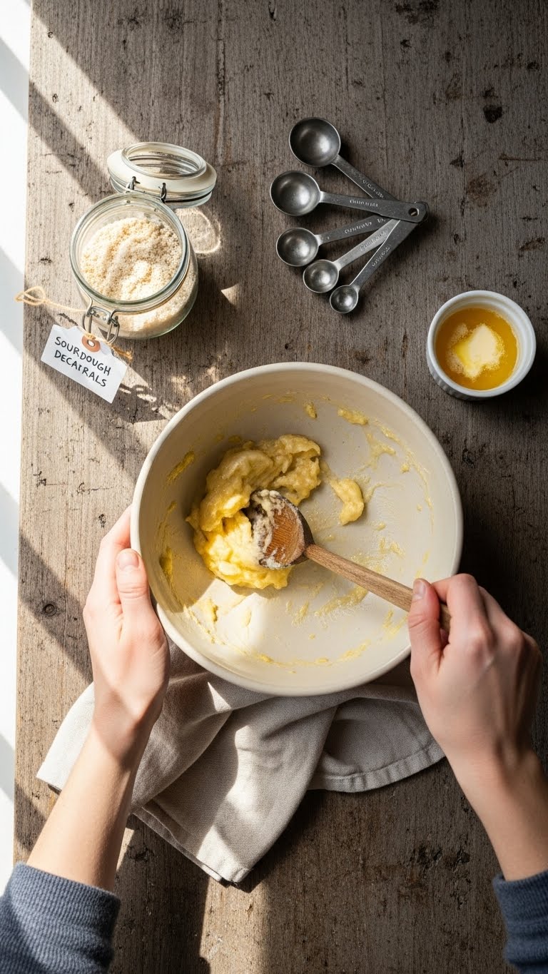 - Add the sourdough discard, egg, melted butter, and vanilla to the mashed bananas. Stir to combine.