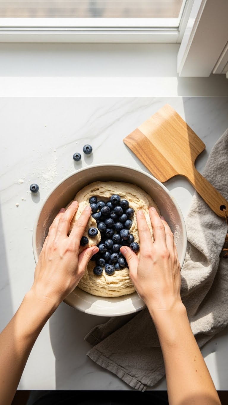 - Fold gently to encase berries; avoid vigorous kneading.
