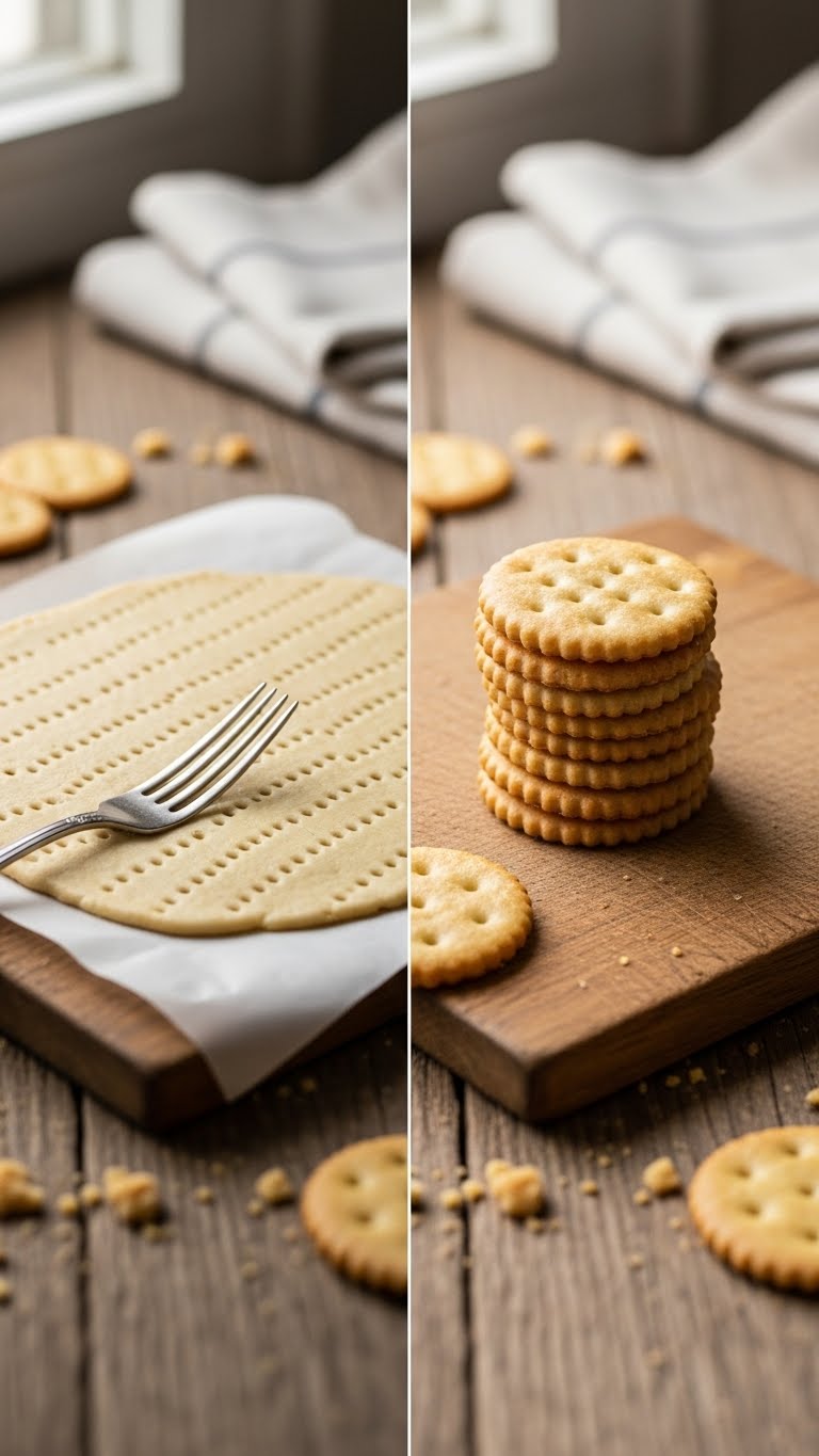 You can vary flavors: add 1 tsp dried rosemary, 1 tbsp sesame seeds, or 2 tbsp grated Parmesan to the dough. For seeded crackers, press seeds lightly into the rolled surface before docking.