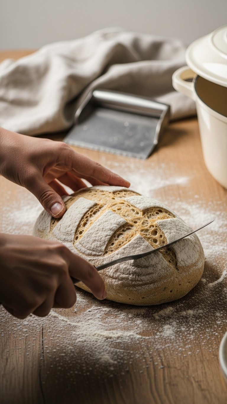 - Score your loaf just before loading; scoring helps steam expand the dough surface.
