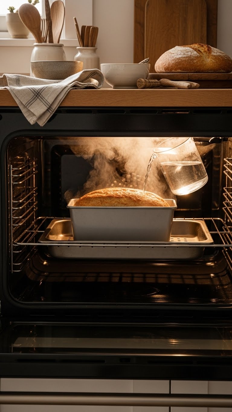 - Slide loaf onto middle rack. Quickly pour 1–2 cups boiling water into the hot tray and close the door.