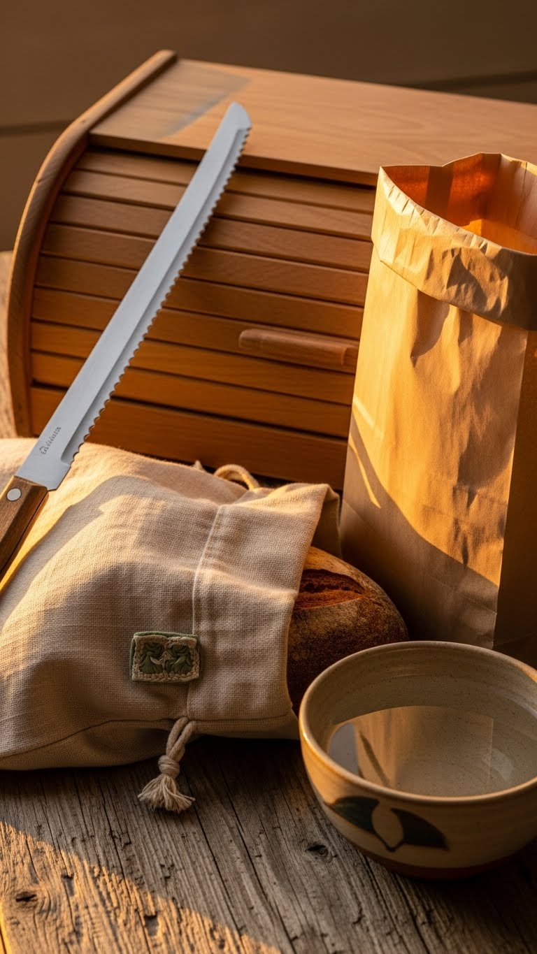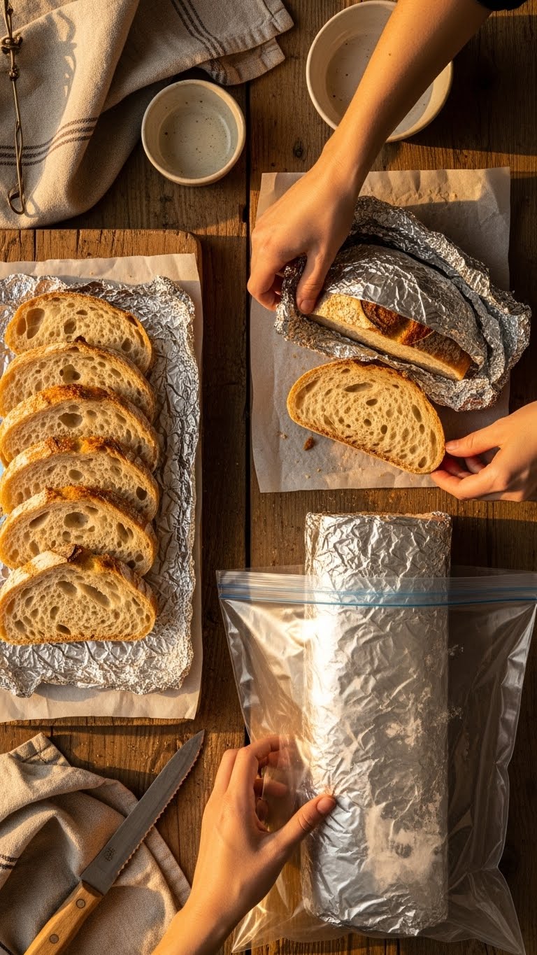 - Materials: linen or cotton bread bag, paper bag, airtight plastic bag (for short-term only), bread box, parchment paper, aluminum foil, and a freezer-safe bag.