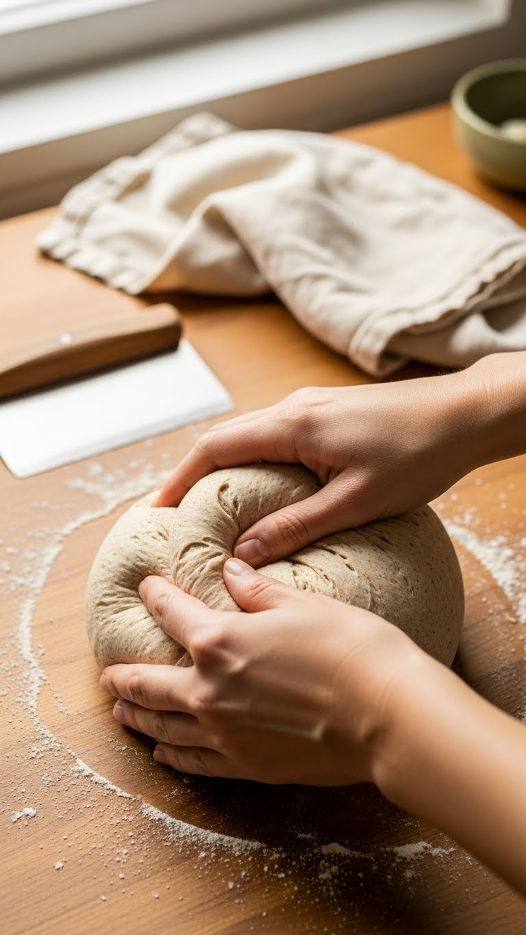 - Final-shape the dough: create surface tension by tucking edges under and rotating the dough against the counter for 10–20 seconds.