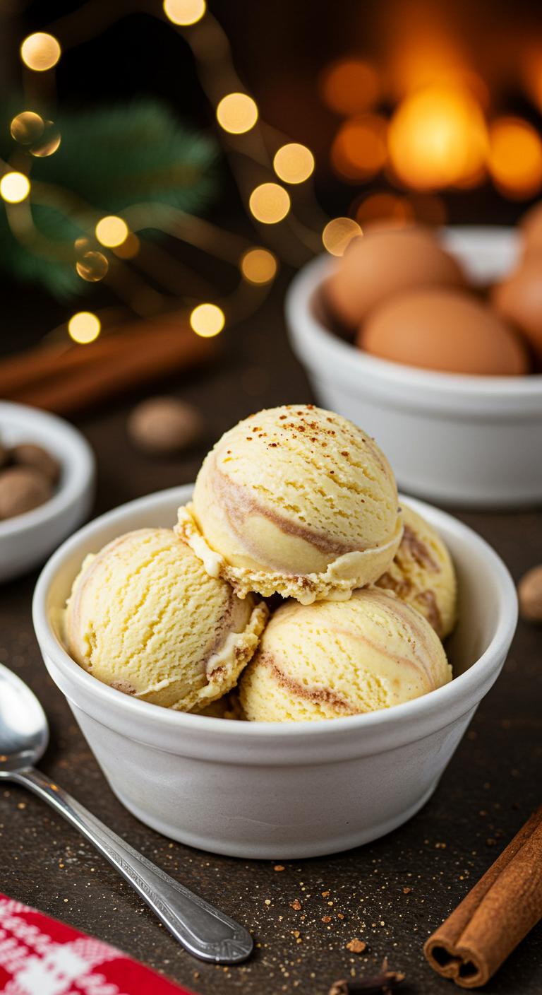 Boozy Eggnog Swirl Ice Cream — creamy, spiked, and perfect for holiday nights.
