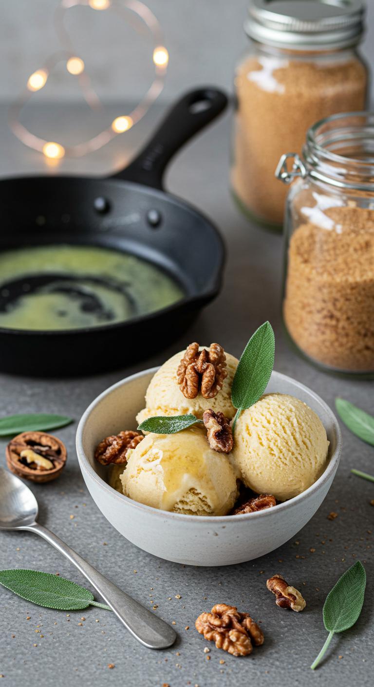 Serve scoops topped with extra candied walnuts and a crisp sage leaf for a holiday-worthy finish. Enjoy every buttery, crunchy bite!