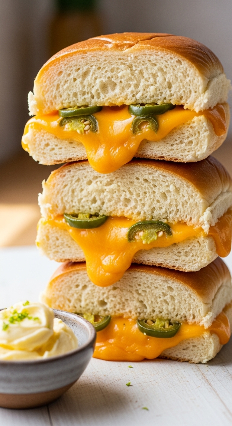 These sandwich buns are soft yet structured, with pockets of cheddar and jalapeño in each roll. Overnight proofing develops flavor without extra work in the morning.