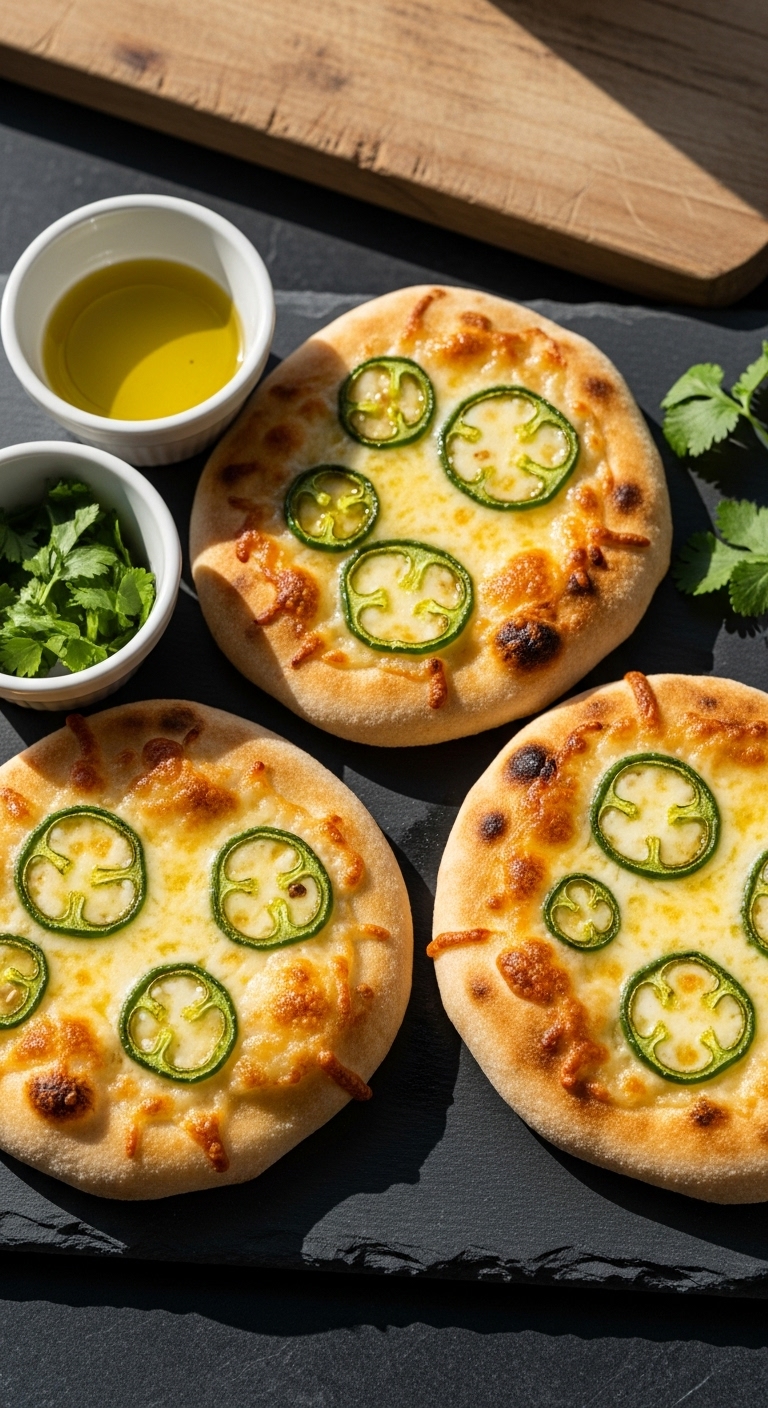 These pan-baked flatbreads give you sourdough flavor fast. They’re thin, crisp at edges, and soft inside with melted cheddar and jalapeño. Quick to cook on a skillet.