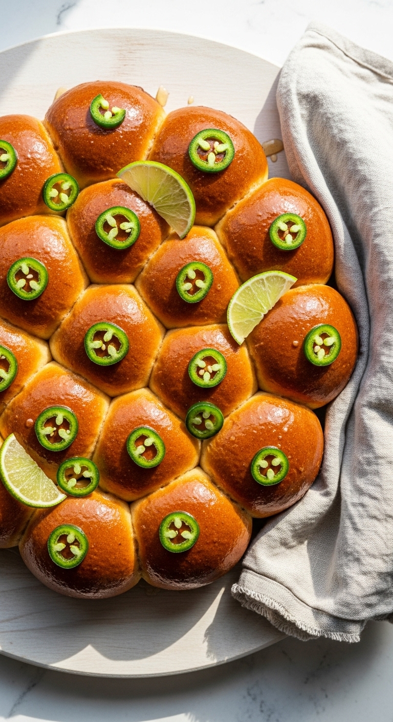 A touch of honey and lime lifts the sourdough base and brightens jalapeño heat. The buns are glossy and slightly sweet with savory cheddar pockets. Lime adds freshness.