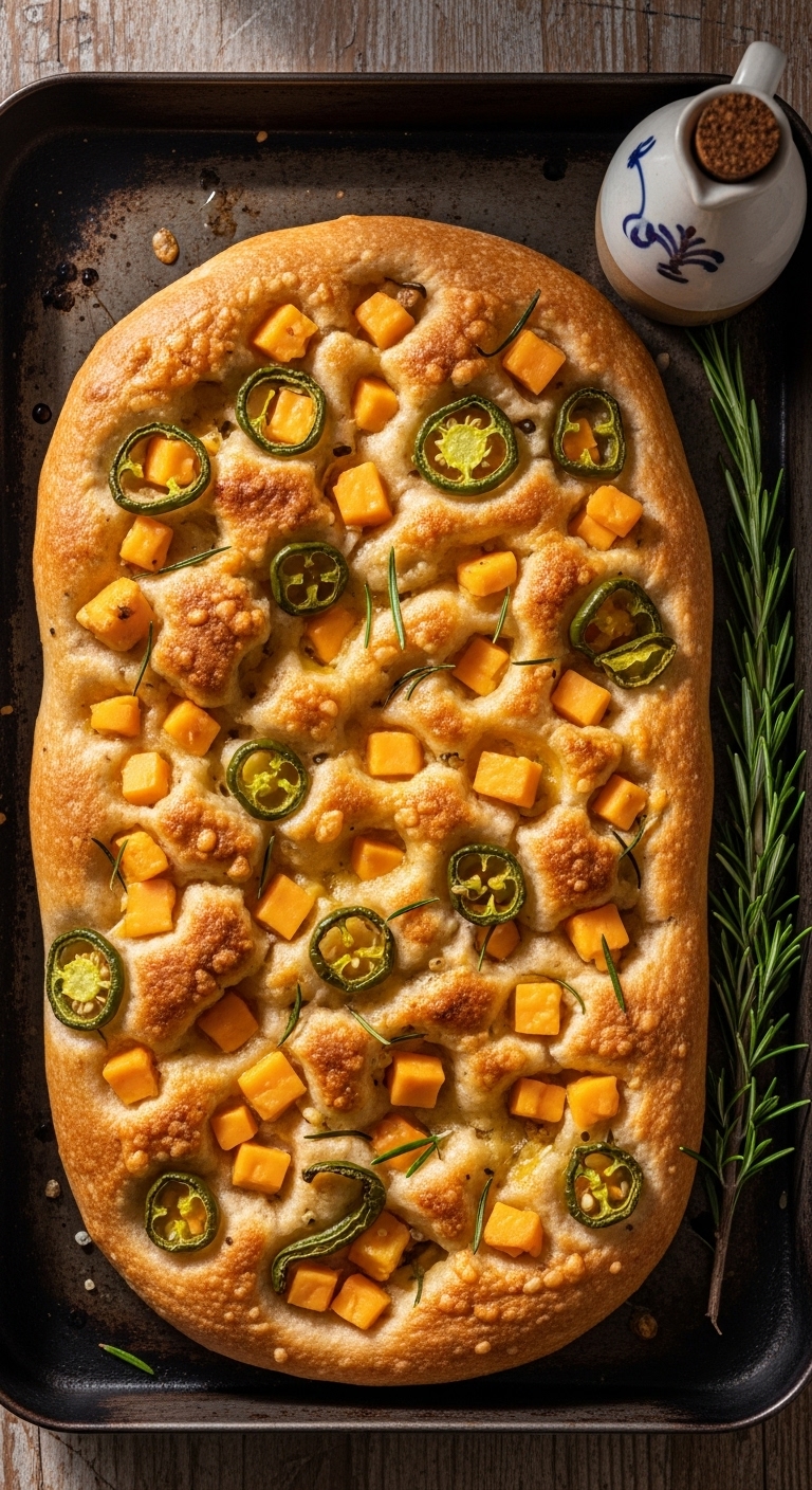Slice into squares and serve with balsamic dipping oil or soup. Garnish with extra rosemary and jalapeño rings. Pair with Chardonnay or light red wine. Store covered at room temp up to 2 days; reheat in oven for freshness. Perfect for picnic baskets and holiday sides.