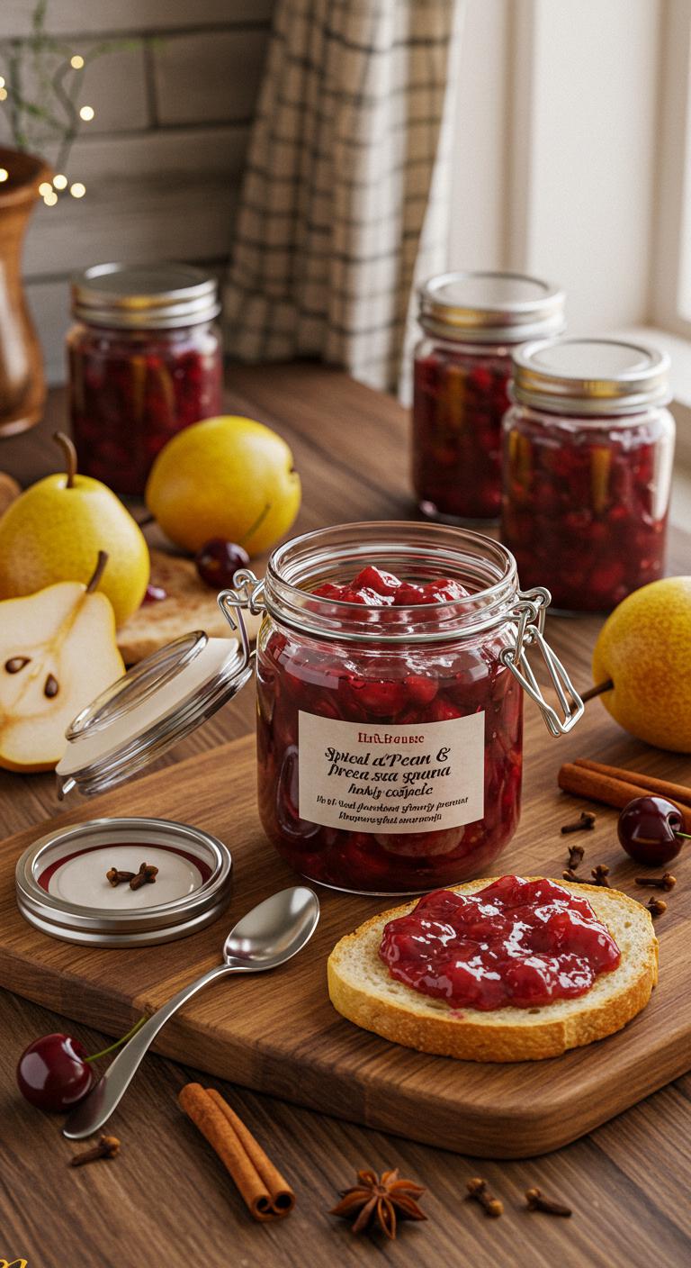 Bright, cozy spiced pear and cherry preserves—perfect for toast, cheese boards, or holiday gifts.