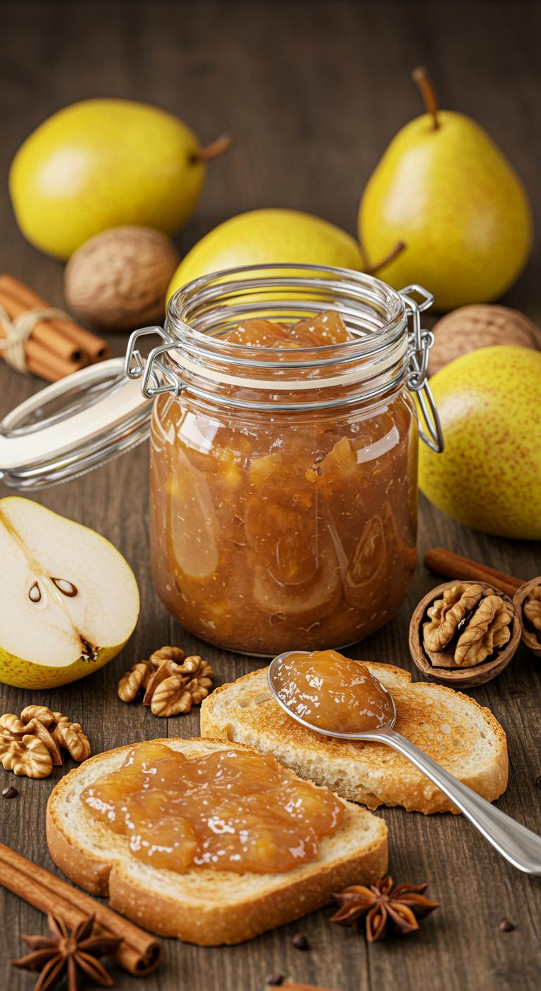 Sweet-spiced pear jam with crunchy walnuts — a cozy spread that tastes like holiday cheer in a jar.
