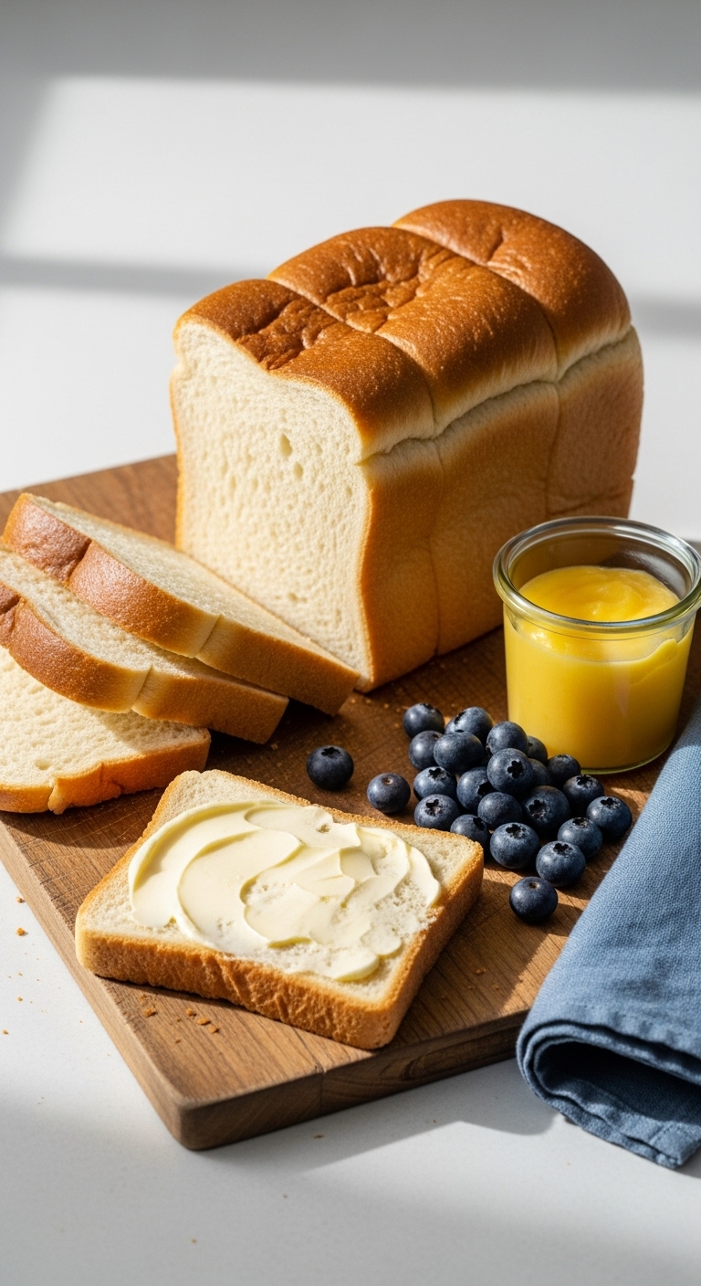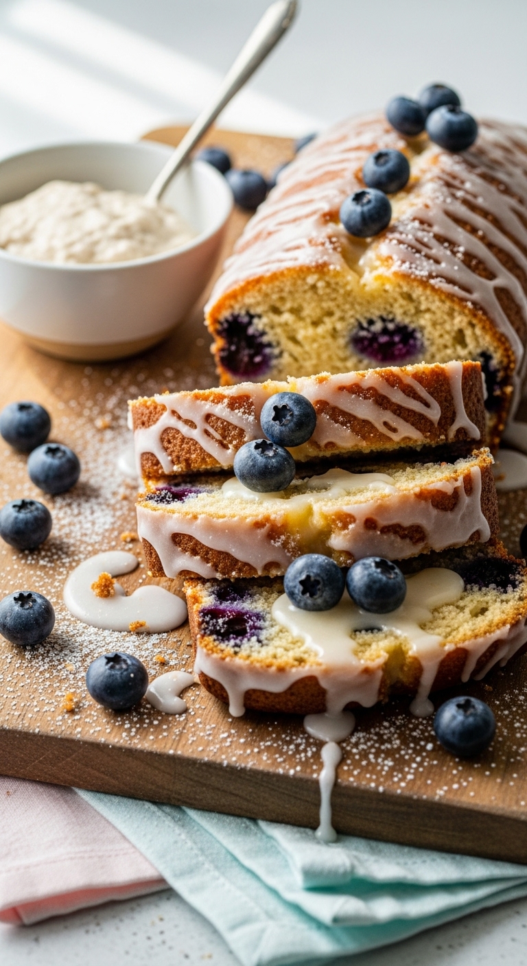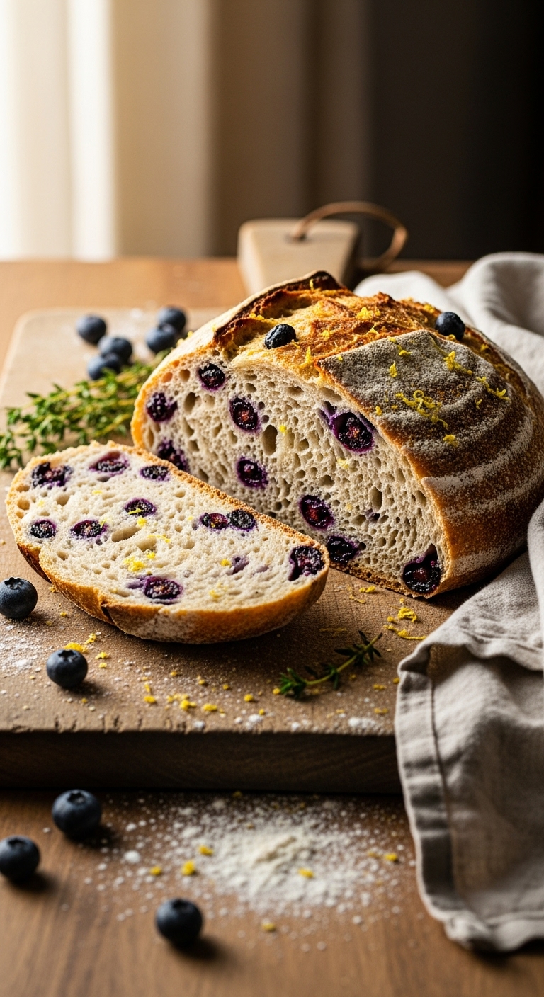 Toast thick slices and spread with lemon curd or ricotta honey. Garnish with extra lemon zest and fresh blueberries. Pair with smoothies, yogurt parfaits, or morning eggs. Store wrapped on the counter 2–3 days or freeze sliced. Make-ahead: shape and refrigerate overnight before baking for morning bread.