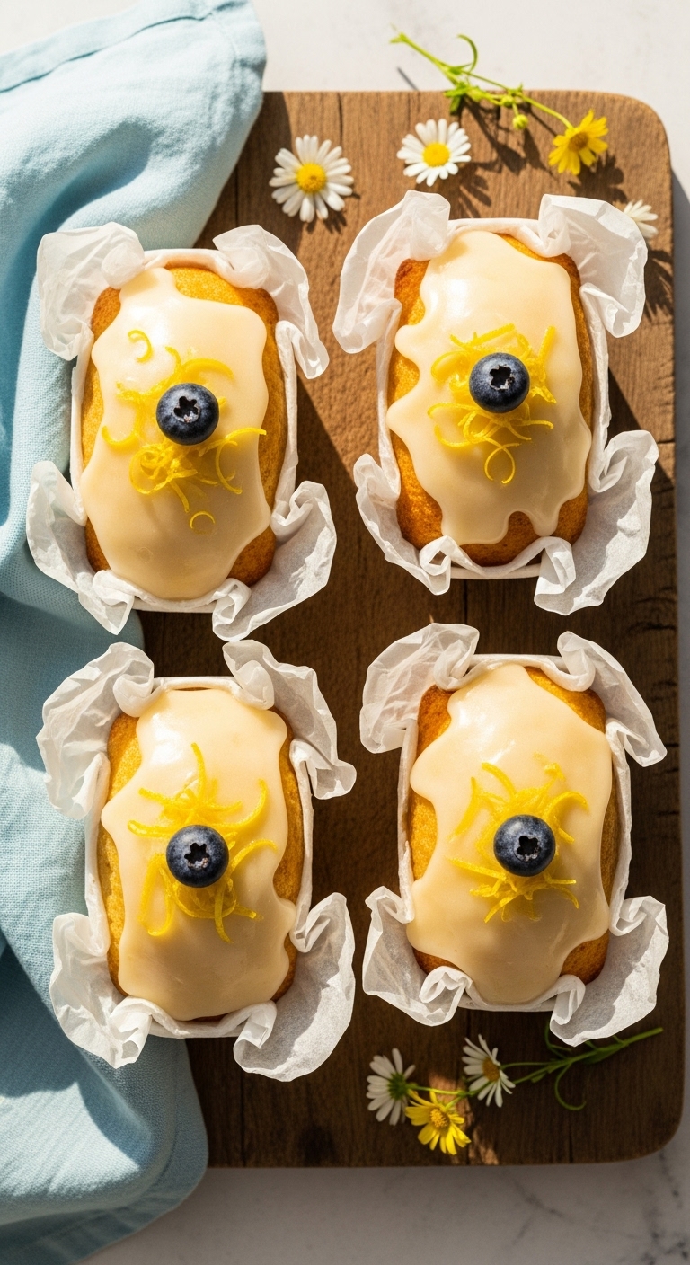 Serve mini loaves for brunch platters or packable snacks. Top with fresh blueberries, lemon zest, or edible flowers for gifting. Pair with coffee or chai. Store individually wrapped for grab-and-go breakfasts. Make-ahead: bake and freeze; thaw and warm before serving.