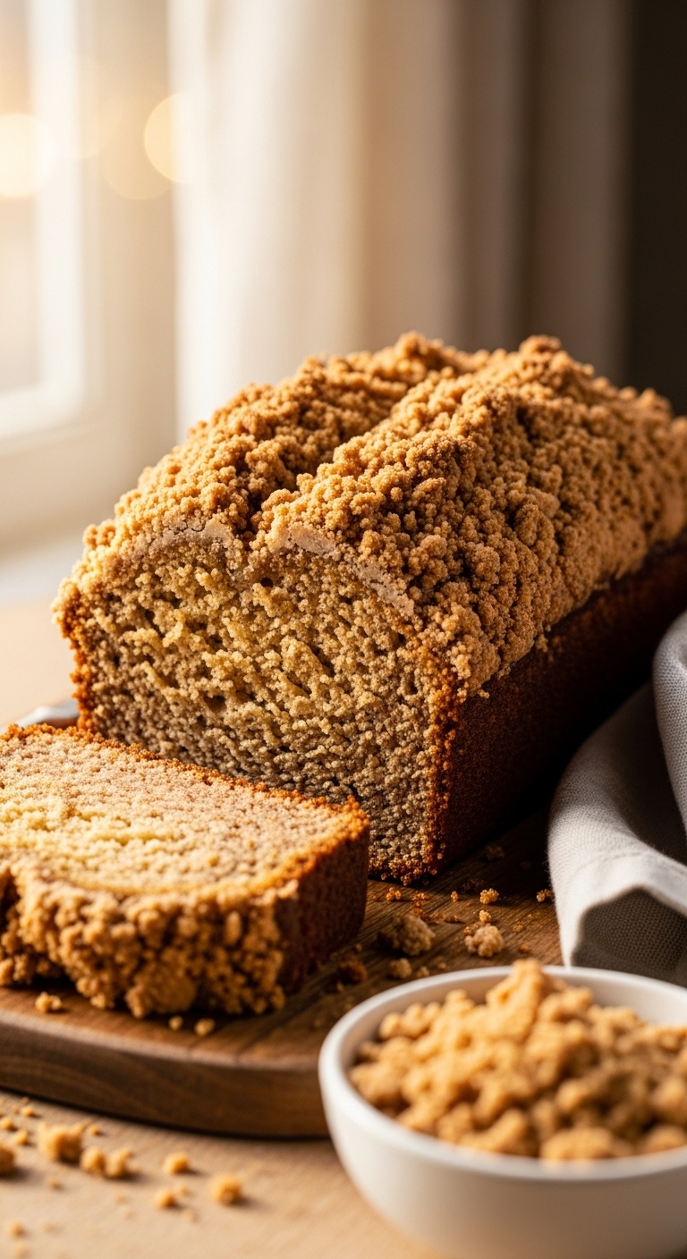 Serve warm for the best streusel crunch. Top with a light lemon glaze or a dusting of powdered sugar. Pair with latte or a fruity herbal tea. Store in an airtight container 2–3 days at room temperature. For longer storage, freeze slices individually.