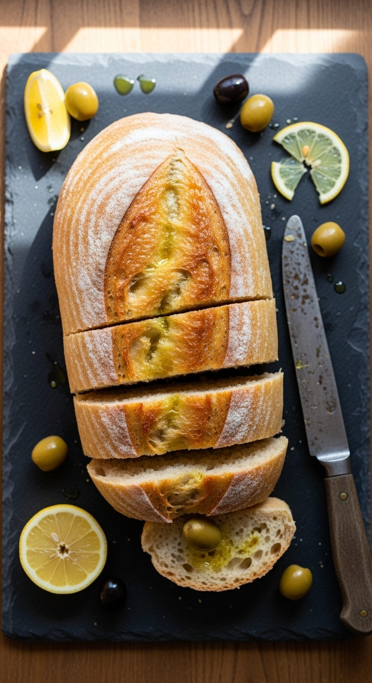 Serve warm with a smear of ricotta or labneh and lemon zest. Pair with herbal teas or rosé. Store at room temperature 2–3 days in an airtight container. Olive oil loaf freezes well for up to 3 months.