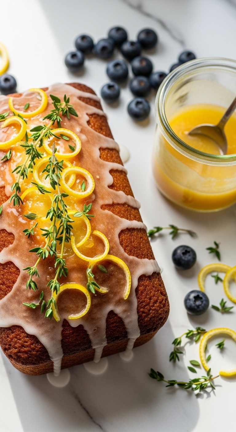 Serve with extra thyme sprigs and thin lemon slices for a fragrant presentation. Pair with chamomile or a light white wine. Store glazed loaf in a cool place 2–3 days; refrigerate in warm weather. Make ahead and warm slices briefly before serving.