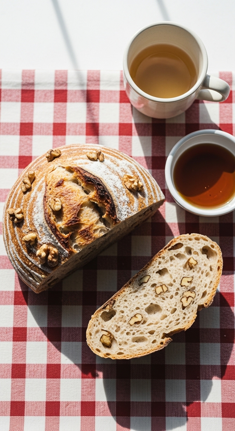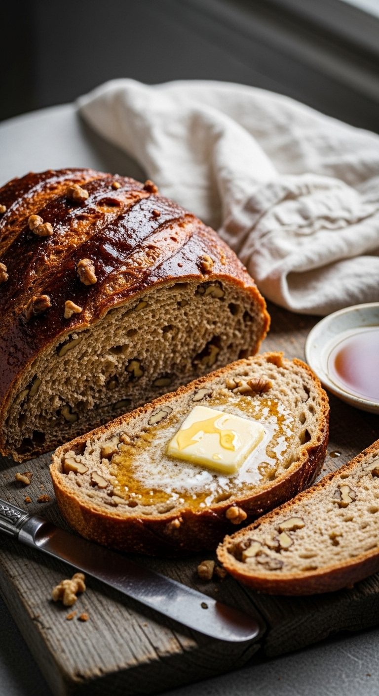 Serve thick slices with avocado and a drizzle of maple. Garnish with extra toasted walnuts. Pairs with strong coffee or smoked cheese. Store wrapped in a cloth bag at room temp for 3 days or slice and freeze. For breakfast meal prep, toast slices and top with nut butter.